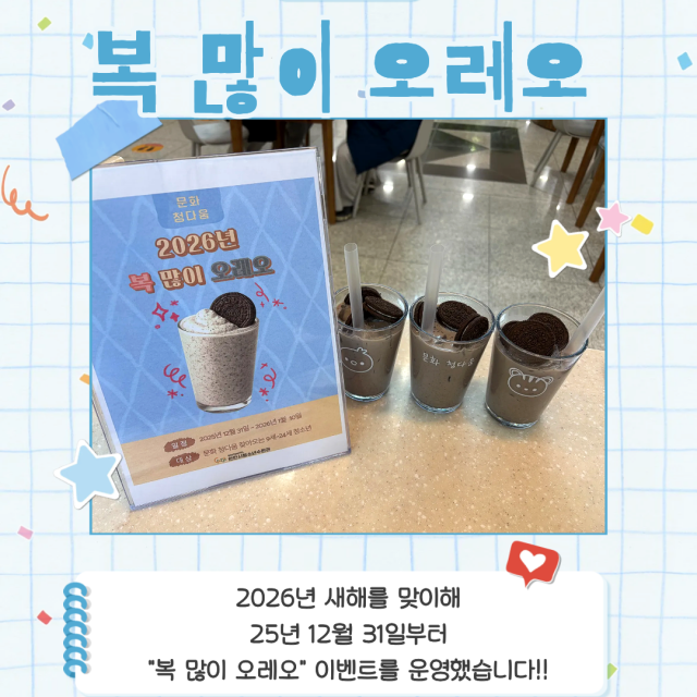 [청당청다움(7호점) 유자차차! 텀블러 챌린지]12월 한 달, 따뜻한 유자차 한 잔으로지구를 지키는 작은 실천에 함께하시겠어요?개인 스테인리스 텀블러만 가져오면따뜻한 유자차가 제공되고,추운 겨울에 딱 맞는 간식까지 함께 드려요!작은 습관이 모이면 큰 변화가 돼요.이번 겨울, 청당 청다움에서 같이 텀블러 챌린지 해볼까요? ☕* 운영기간: 12.1 ~ 12.31 (주말 제외)* 운영장소: 청당청다움(7호점)따뜻한 한 잔으로 마음까지 포근해지는 12월 보내요:)