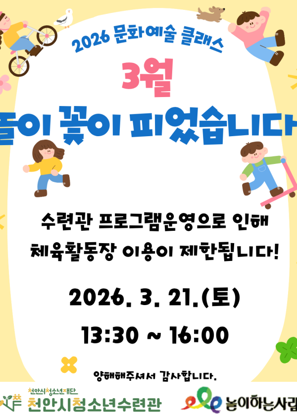 [2026 문화예술 클래스] 3월 놀이 꽃이 피었습니다 놀이로 관계가 꽃피는 시간 원대형놀기, 어미새와 아기새, 나비 술래잡기까지!친구들과 함께 웃고 뛰며즐거운 추억을 만들었습니다 #문화예술클래스 #놀이꽃이피었습니다 #3월#놀이하는사람들 #천안시청소년재단#천안시청소년수련관