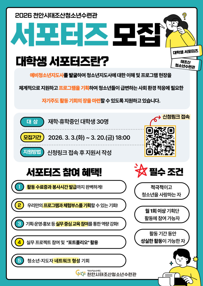 천안시태조산청소년수련관에서 청소년과 함께 배우고, 기획하고, 성장할 대학생 서포터즈를 모집합니다!!!