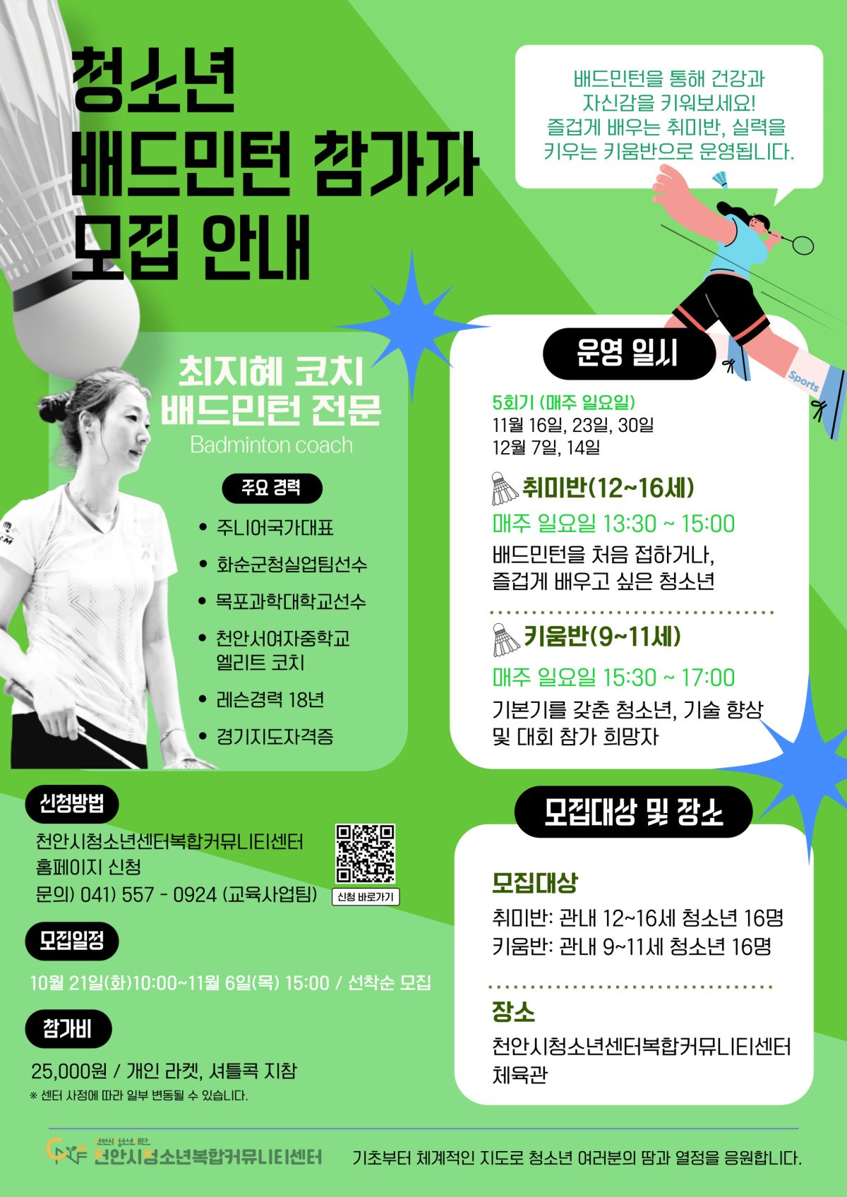 배드민턴을 통해 건강과 자신감을 키울 수 있는 청소년 배드민턴 프로그램 참여자를 모집합니다!