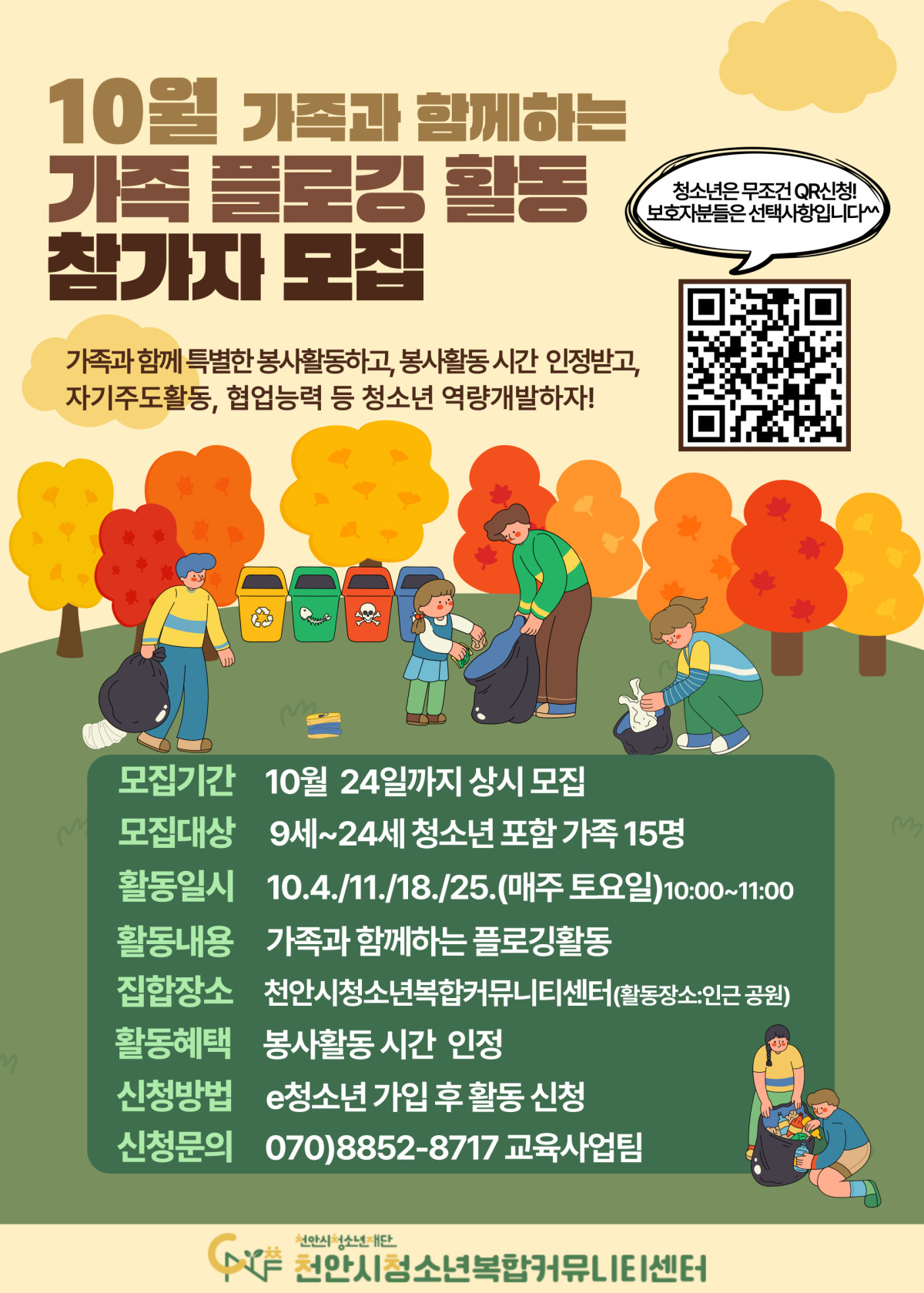 10월 가족 플로깅 참여자 모집 안내 페이지 정보 작성자 복합커뮤니티센터 작성일 25-09-25 14:30 조회 108회 본문 10월 가족과 함께하는 "가족 플로깅"함께 하고 싶은 청소년은 아래 링크 접속 후 신청 바랍니다.봉사활동 찾기 < 청소년자원봉사 Dovol < 청소년활동 | 청소년활동정보서비스 e청소년 이전글천안시청소년복합커뮤니티센터 10월 체육관 이용 안내 다음글한·일 청소년 교류 프로그램 대학생 참여자 모집 목록