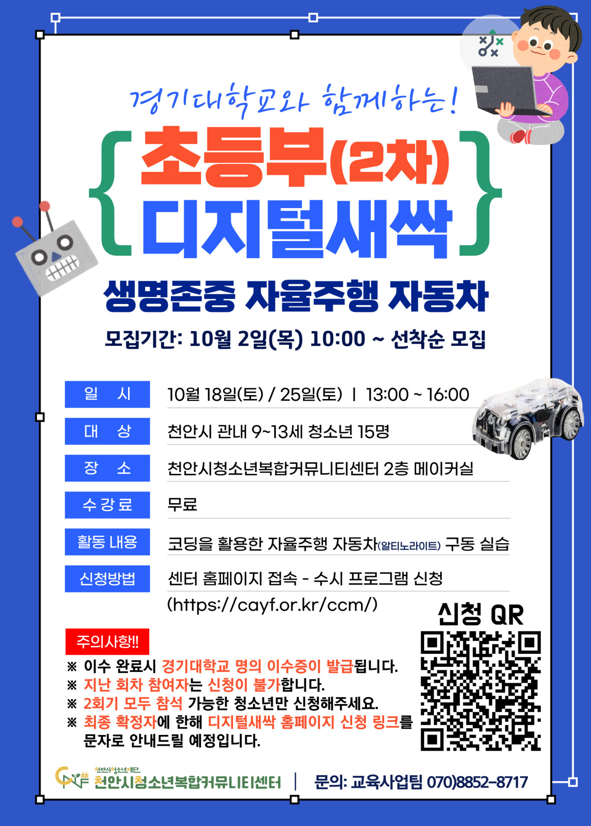 초등 디지털 새싹 2차 "생명존중 자율주행 자동차" 프로그램 참여자를 모집합니다.