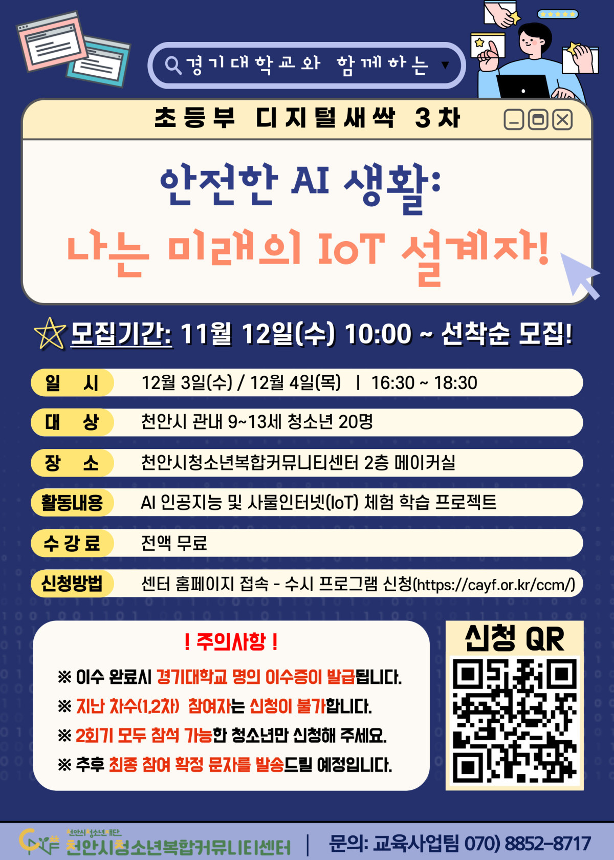초등 디지털 새싹 3차 "안전한 AI생활: 나는 미래의 IoT 설계자!" 프로그램 참여자를 모집합니다.