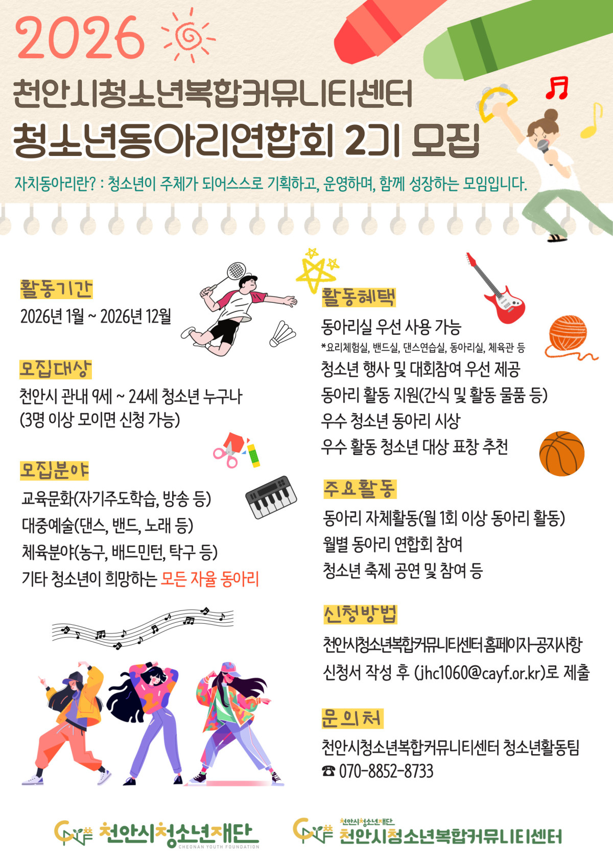 2026년 천안시청소년복합커뮤니티센터 청소년 자치동아리 모집 페이지 정보 작성자 복합커뮤니티센터 작성일 25-12-27 11:54 조회 204회 본문 첨부파일 2026 천안시청소년복합커뮤니티센터 청소년동아리연합회 신청서.hwp (2.3M) 16회 다운로드 | DATE : 2025-12-27 11:54:38 이전글[불당 청다움(8호점) 2026년 1월 운영시간 안내] 다음글2026년 부모님과 함께하는 겨울방학 AI 미디어 캠프 안내 목록
