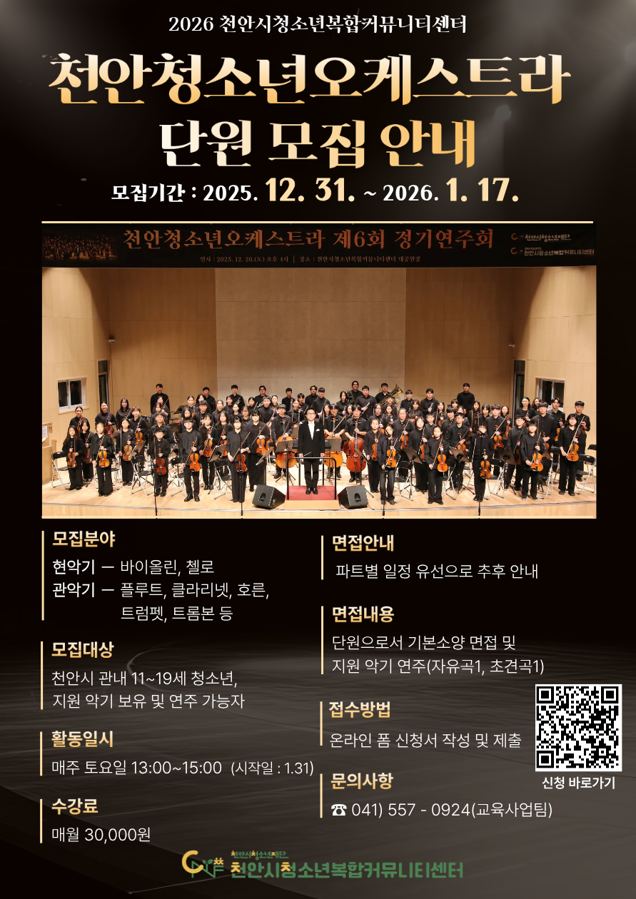 천안시청소년복합커뮤니티센터에서 2026년 천안청소년오케스트라 신규 단원을 모집합니다~관심있는 청소년은 많은 신청 부탁드립니다.