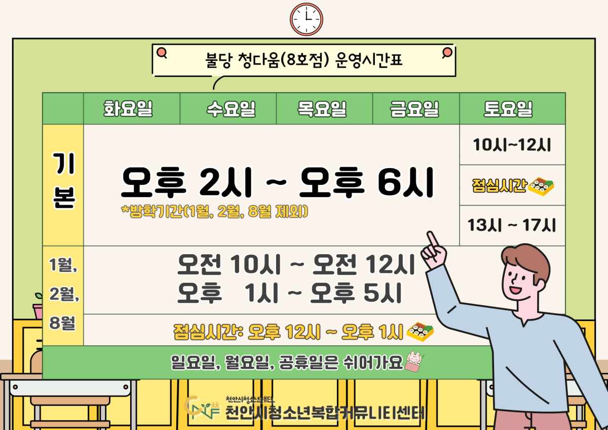 3월부터 불당 청다움 운영시간이 이렇게 진행됩니다 :D