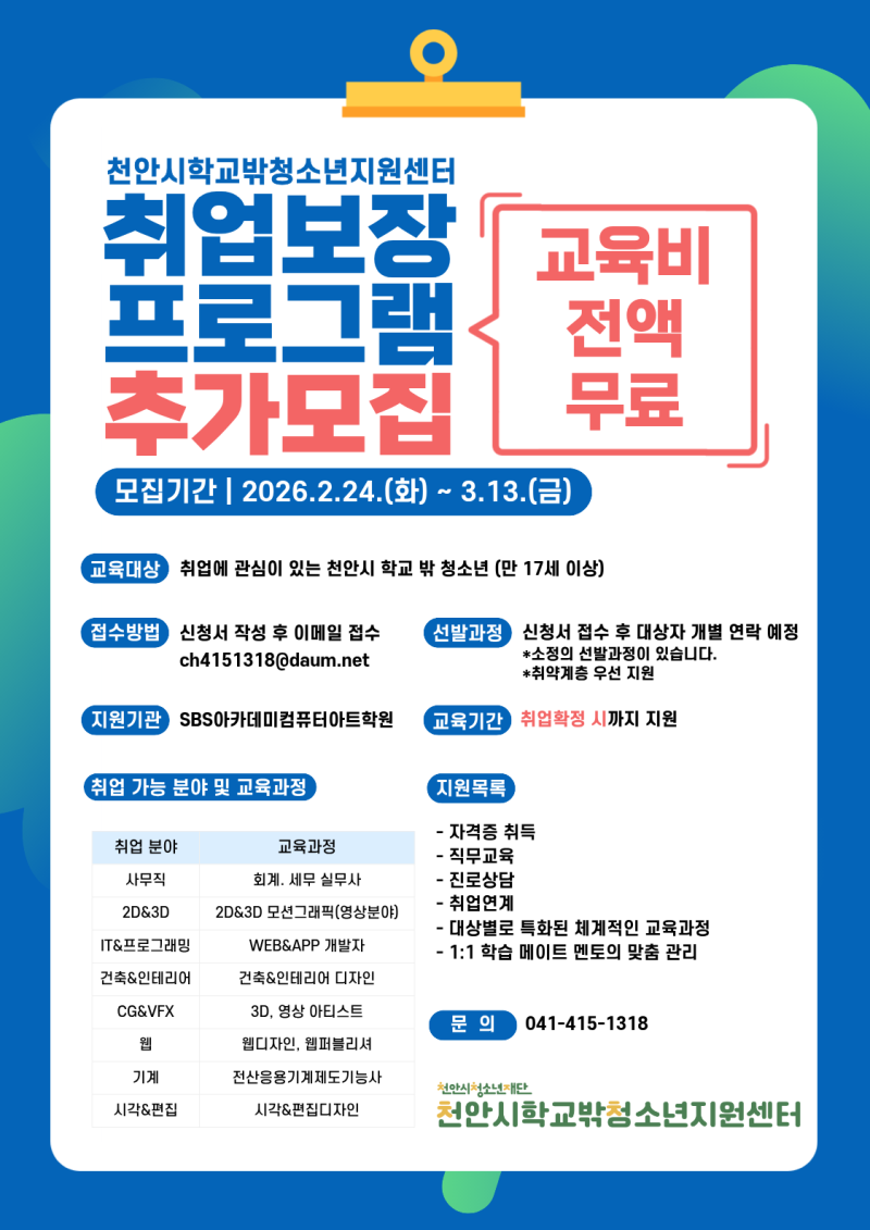 - 교육대상 : 취업에 관심이 있는 천안시 학교 밖 청소년 (만 17세 이상) *취약계층 우선 지원