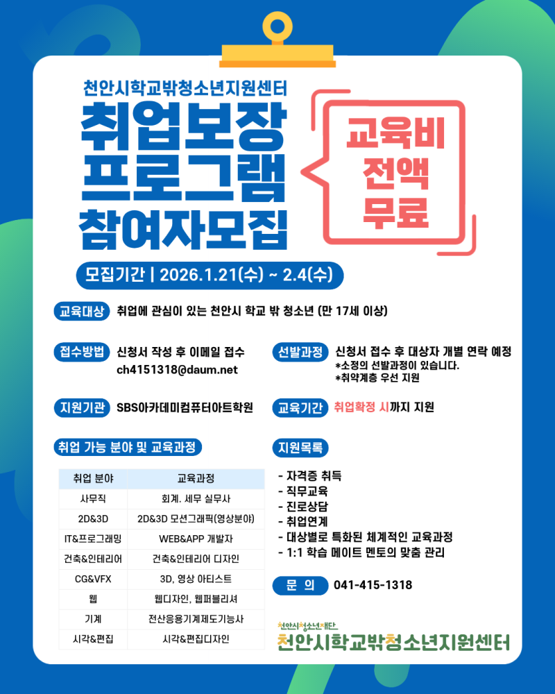 | 신청대상 | 취업에 관심이 있는 천안시 학교 밖 청소년 (만 17세 이상) |