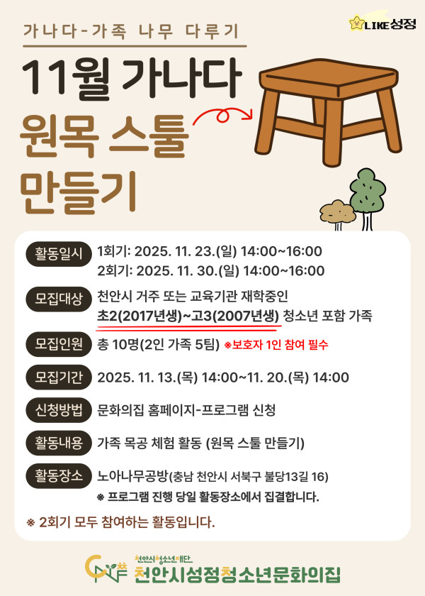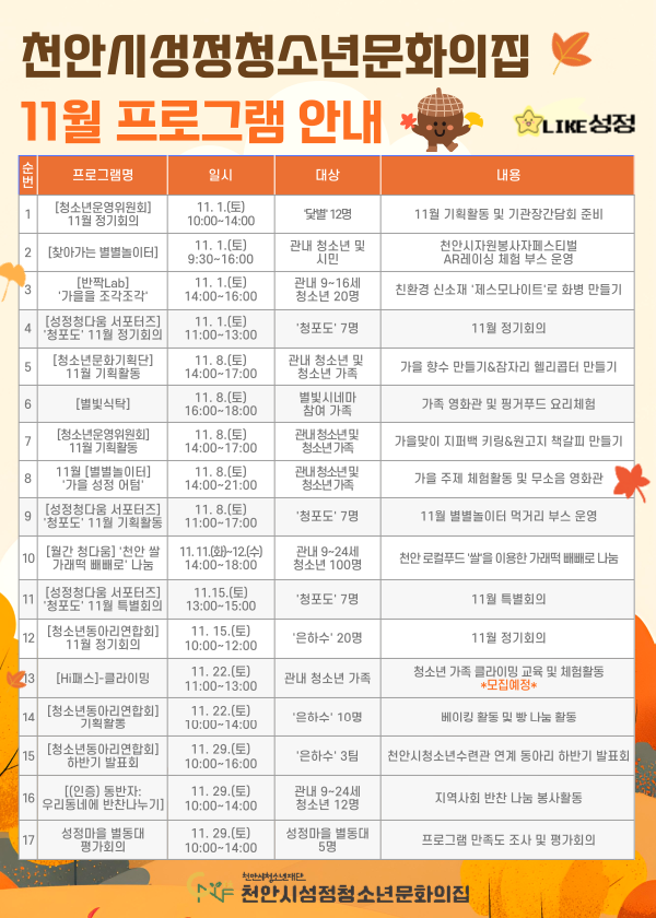 [안내] 천안시성정청소년문화의집 11월 프로그램 안내