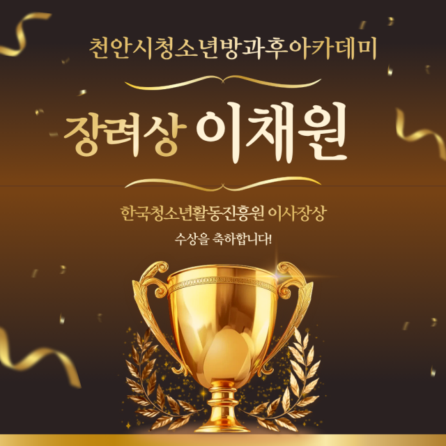 #천안시청소년재단#천안시청소년수련관#천안시청소년방과후아카데미 방과후아카데미 재학중인 3학년 이채원 학생이 작성한 청소년방과후아카데미 활동수기 공모전에서 장려상을 수상하는 성과를 이루었습니다!!!????????????????????????방과후아카데미를 다니며 느낀 감정들을 직접 글로 작성하였고, 그 결과 한국청소년활동진흥원 이사장상을 수상하였습니다!앞으로도 빛날 청소년들의 앞날에 방과후아카데미가 함께하겠습니다!빛나는 청소년과 함께할 천안시청소년방과후아카데미는 현재 초6(예비중1)-중2 신입생을 모집중에 있습니다!문의) 041-900-0905