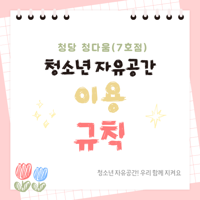 청당 청다움 이용규칙, 같이 지켜볼까요? 청소년 자유공간 청당 청다움은여러분 모두가 함께 만들어가는 공간입니다 더 안전하고, 더 편안한 공간을 위해작은 약속들을 카드뉴스에 담았어요 ✔ 서로 존중하는 말하기✔ 뛰지 않기✔ 인사하기✔ 깨끗하게 사용하기✔ 자전거는 거치대 이용하기우리 모두가 지키면더 좋은 청다움이 됩니다 함께 지켜주세요!