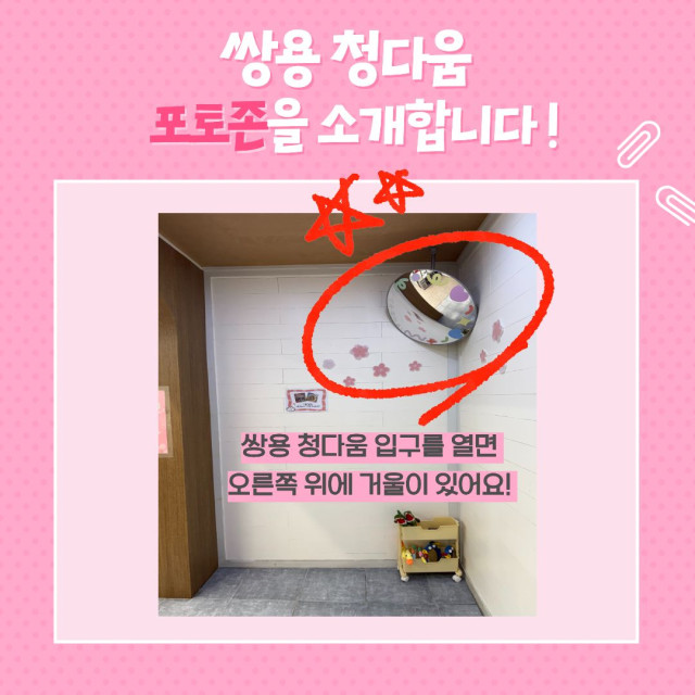 여러분, 쌍용 청다움에새로 생긴 거울 포토존 알고 있었나요? 청다움 문을 열고 들어오면우측 상단에 동그란 거울이 있답니다! 높은 위치에 있어서그동안 잘 못 봤을 수도 있어요 ????친구들과 함께 사진을 찍을 수 있도록다양한 소품과 함께 포토존을 만들었어요 혼자 찍어도 OK!친구들과 함께라면 더 예쁘게 나오는 거울 포토존 ????쌍용 청다움에 놀러오면꼭 한 번 찍고 가보세요 ><#천안시청소년재단 #천안시청소년수련관#쌍용청다움(1호점)