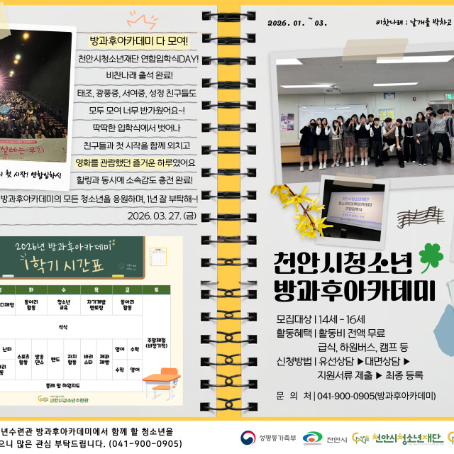 #천안시청소년재단#천안시청소년수련관#천안시청소년방과후아카데미2026년 1월부터 3월까지,청소년들의 다양한 활동과 성장 이야기를 담은1분기 소식지가 발간되었습니다!공연·체험·학습까지방과후아카데미의 생생한 현장을 확인해보세요.앞으로도 이어질 다양한 활동에많은 관심과 응원 부탁드립니다.천안시청소년방과후아카데미는 신입생을 계속 모집 중입니다!문의) 041-900-0905