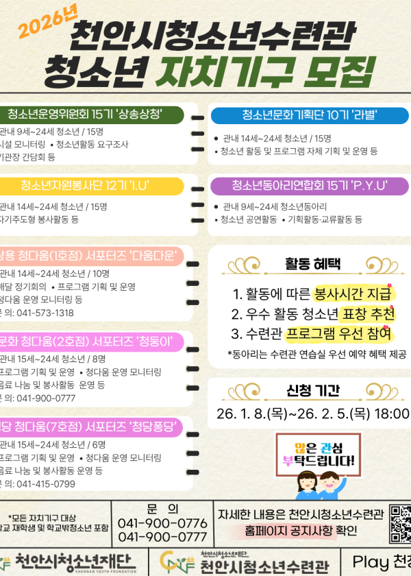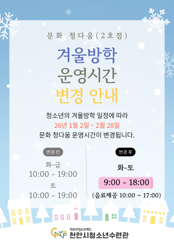 지난 12월 19일,쌍용 청다움 운영위원회 ‘다움다운’ 2025년 활동 평가회의를 진행했습니다!한 해 동안의 활동을 돌아보며각자 인상 깊었던 순간, 좋았던 점,그리고 앞으로 더 나아가기 위한 개선점까지함께 이야기 나누는 시간을 가졌어요!또한 롤링페이퍼를 통해서로에게 감사와 격려의 마음을 전하며따뜻한 메시지를 나누기도 했답니다 올 한 해를 돌아보니다움다운 친구들의 활약이 특히 빛났고,서로에게 의미 있는 시간이 되었던 것 같아요2026년에도 쌍용 청다움의 다움다운을 기대해주세요!곧 시작될 2026년 쌍용 청다움 서포터즈 모집에도많은 관심 부탁드립니다#천안시청소년재단#천안청소년수련관#쌍용청다움(1호점)#천안시태조산청소년수련관#천안시청소년복합커뮤니티센터#천안시성정청소년문화의집#천안시청소년상담복지센터#천안시학교밖청소년지원센터