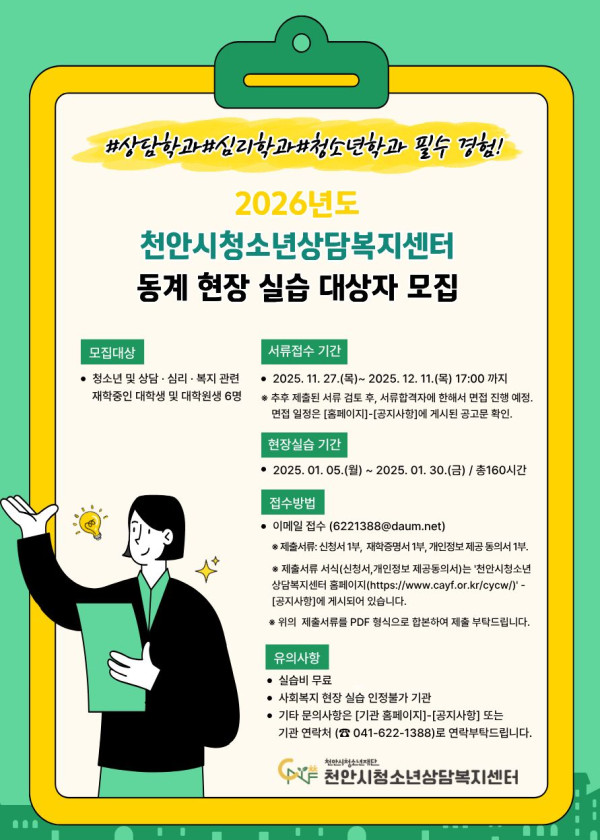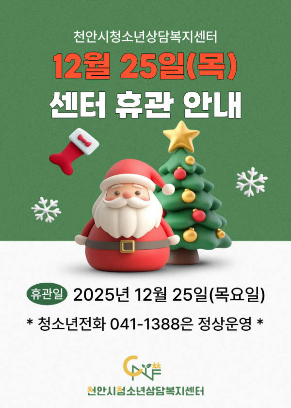 1:1 찾아가는 전문상담 서비스를 제공하는, 청소년 동반자"청소년동반자 주간사례회의"일시 : 2025. 12. 24.(수) 10:00~12:00장소 : 천안시청소년상담복지센터 교육장발표자 : 차윤승 선생님이번 주에는 올 한해를 마무리하는 마지막 주간사례회의를 진행하였습니다친구로부터 지속적된 괴롭힘으로 분노와 억울함을 경험하는 내담자의 사례를 통해 상담사가 내담자의 감정을 반영하고,안전하게 감정을 표현할 수 있도록 돕는 과정이 그 무엇보다 필요하고 중요하다는 사실을 다시한 번 느낄 수 있는 시간이었습니다더불어 긴 시간동안 상담 전문성과 따뜻한 관심으로청소년의 성장과 회복에 힘써주신동반자 선생님들의 마지막을 함께하며,앞 날을 응원하는 뜻깊은 시간도 가졌습니다 2026년에도 청소년의 마음건강을 위하여 노력하겠습니다상담이 필요한 청소년이 있다면,청소년전화1388로 언제든지 연락주세요청소년전화1388