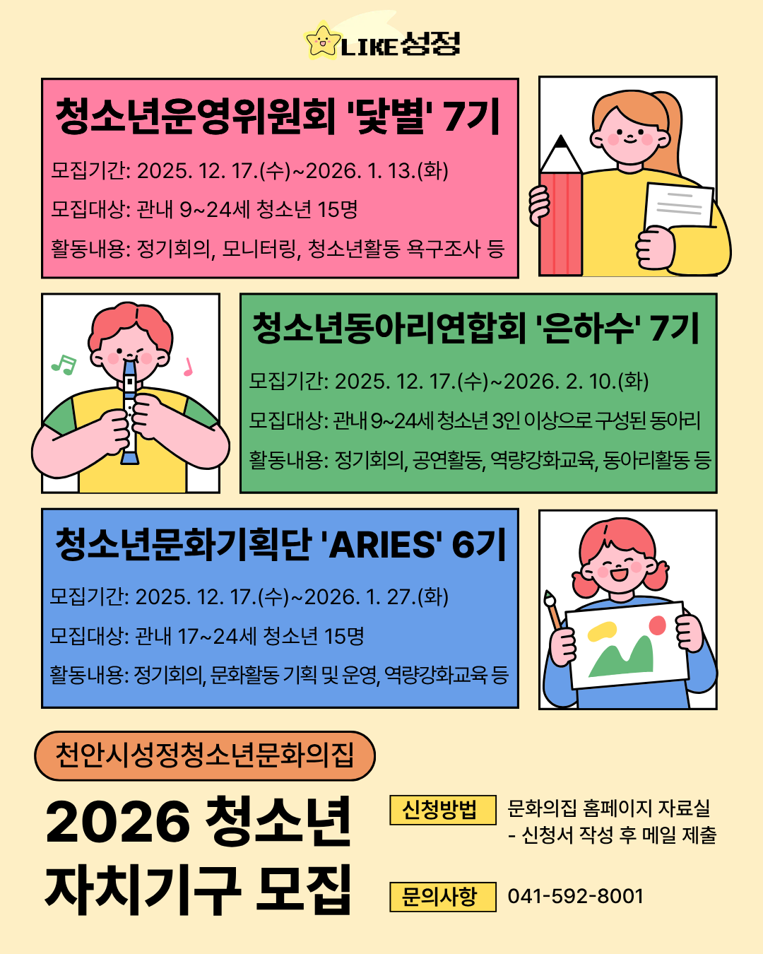 ■ 관련문의: 천안시성정청소년문화의집 ☎070-4141-8791