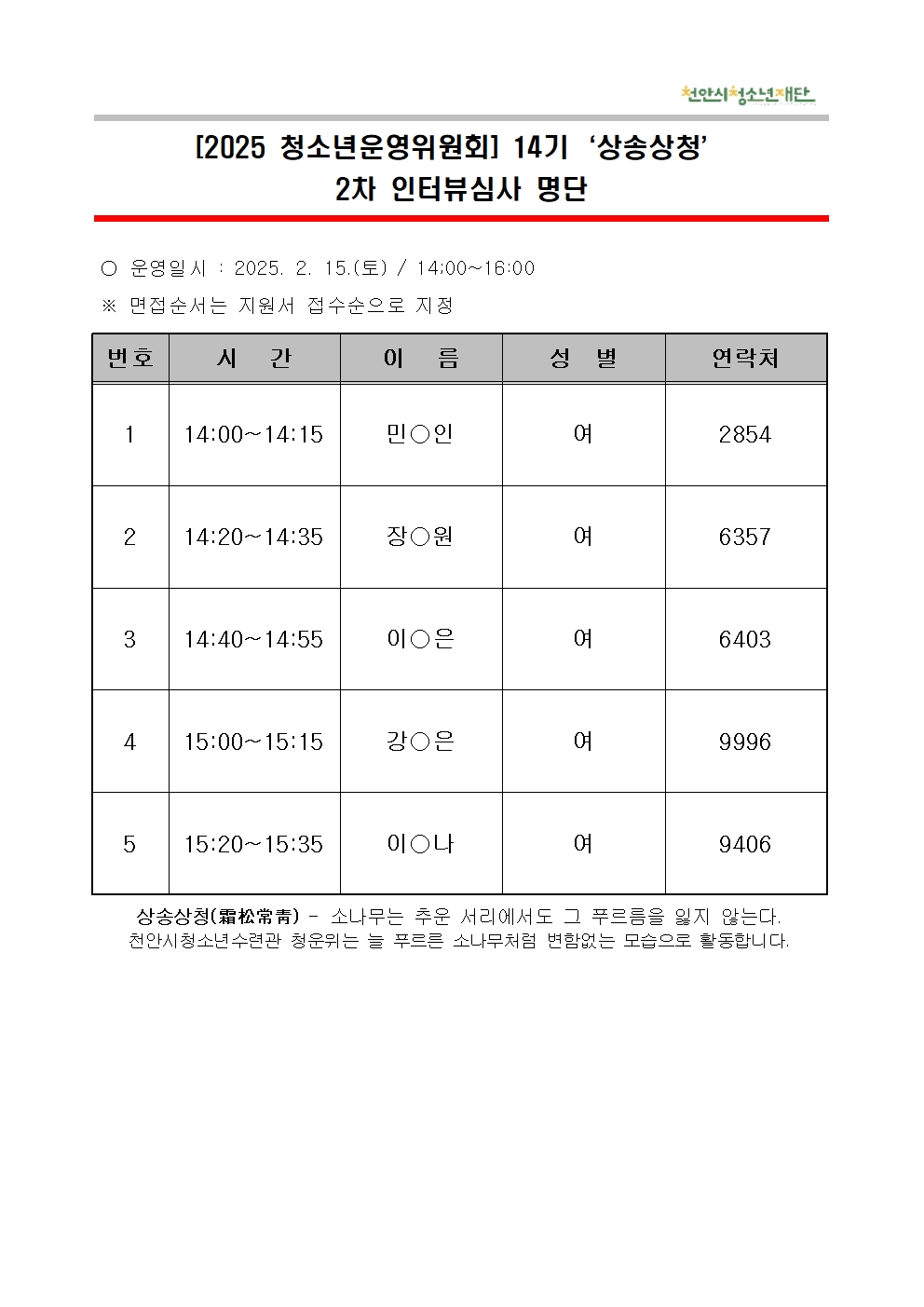 프로그램 [2025 청소년운영위원회] 상송상청 14기 2차 인터뷰심사 명단 안내 페이지 정보 작성자 천안시청소년수련관 작성일 25-02-12 16:32 조회 784회 본문 일정 확인 후 늦지않게 참석 바랍니다. 이전글[2025 문화예술 클래스] 우드버닝 참가자 모집 다음글[K디지털그라운드] 예술가가 된 AI로봇 2차 참가 청소년 모집 목록
