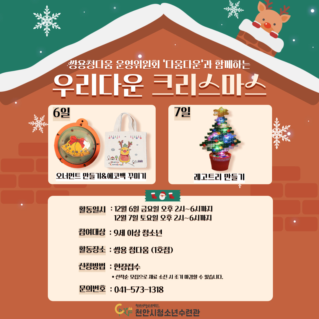 쌍용 청다움에서 크리스마스를 청소년 친구들과 함께 즐기고 싶어서 프로그램들을 준비해 보았습니다 !!