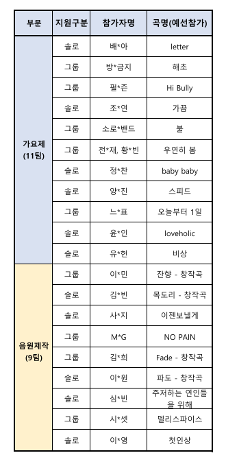 그 결과, 가요제 부문 11팀, 음원제작 부문 9팀이 예선을 통과하였습니다.