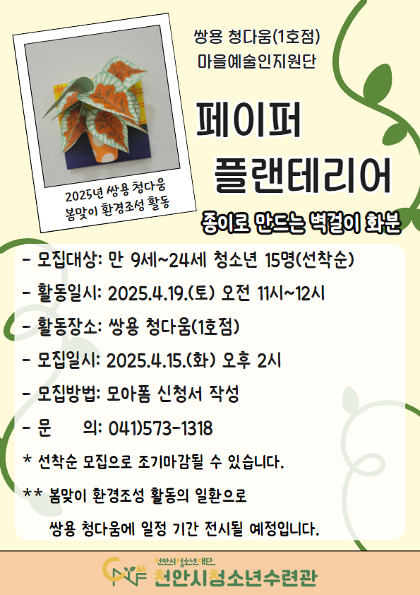 프로그램 쌍용 청다움(1호점) 마을예술인지원단 '페이퍼 플랜테리어' 프로그램 참여자 모집
